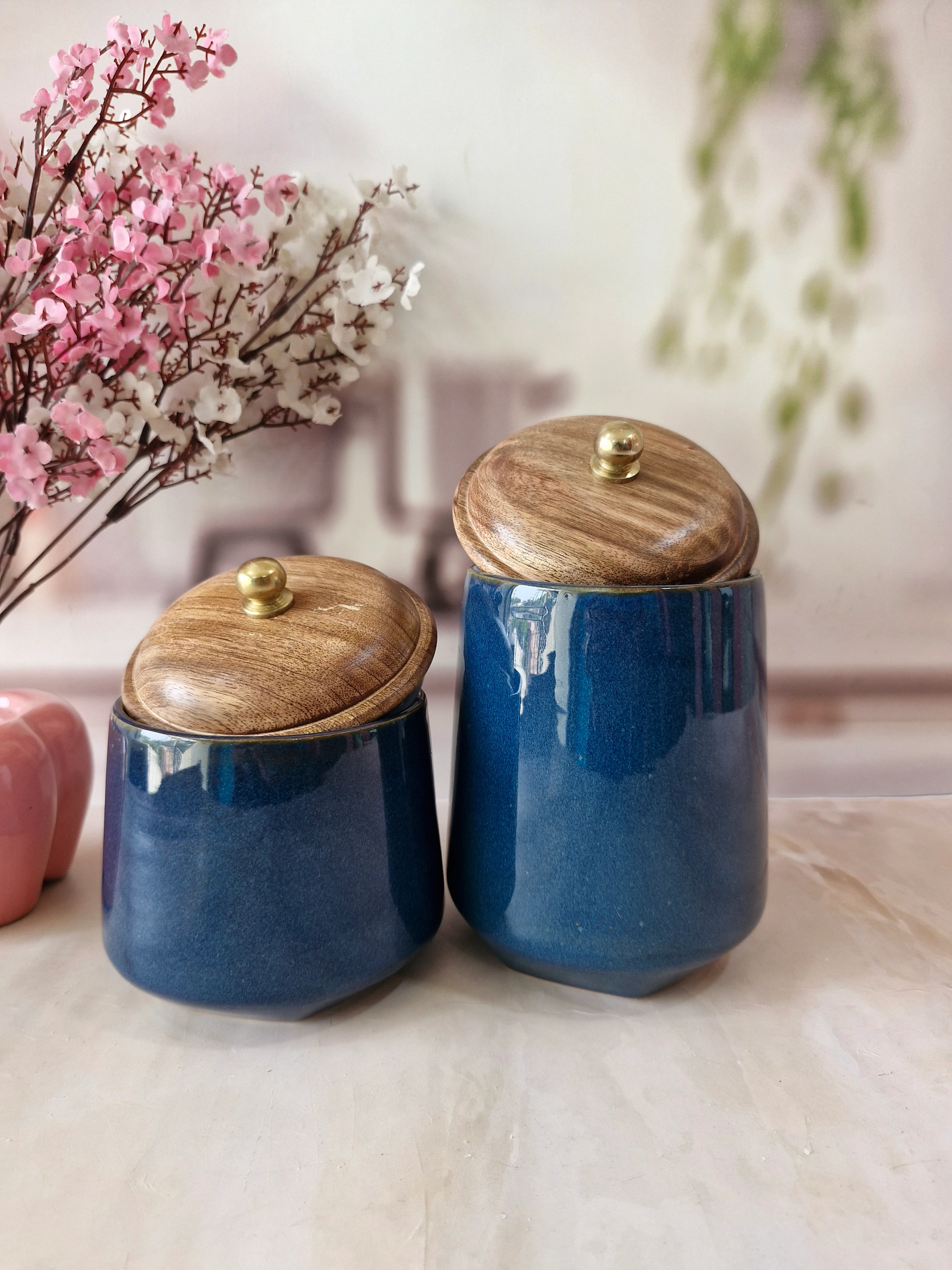 Elevate your kitchen storage. Beautiful blue ceramic Jar with elegant wooden lids, designed for both beauty and practicality. Organize and store your spices and cookies effortlessly with These airtight jars come in a set of 2 with a capacity of 1kg and 1/2 kg each.