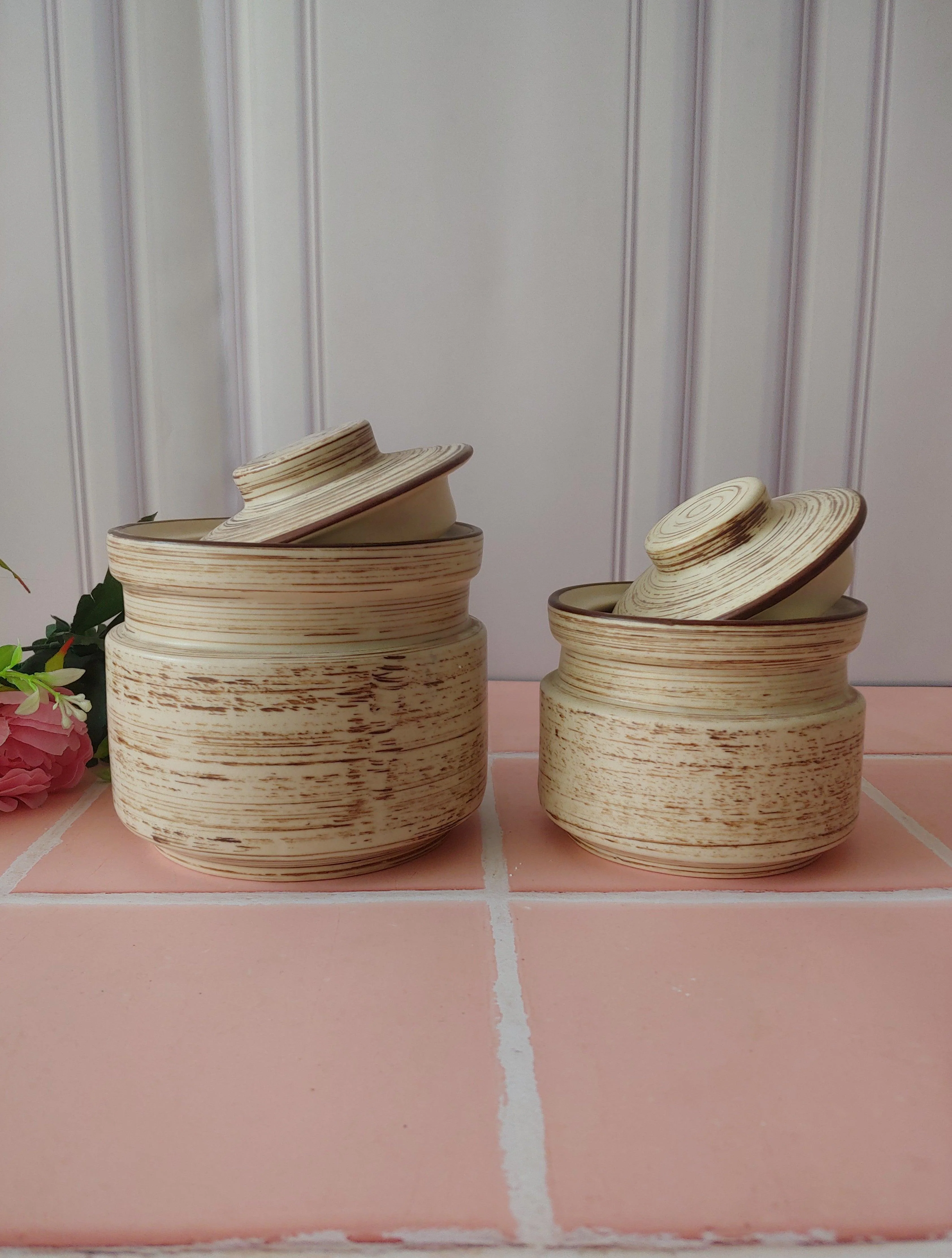 Introducing Ceramic burni Kimchi Pickle Jar Delight, a set of ceramic jars with lids and t perfect for storing your homemade pickles, kimchi, sauerkraut, or any other fermented food. These jars ensures your pickles stay fresh and crispy for longer. Made from durable ceramic and pine wood, these jars are easy to clean and will look great on your kitchen counter.