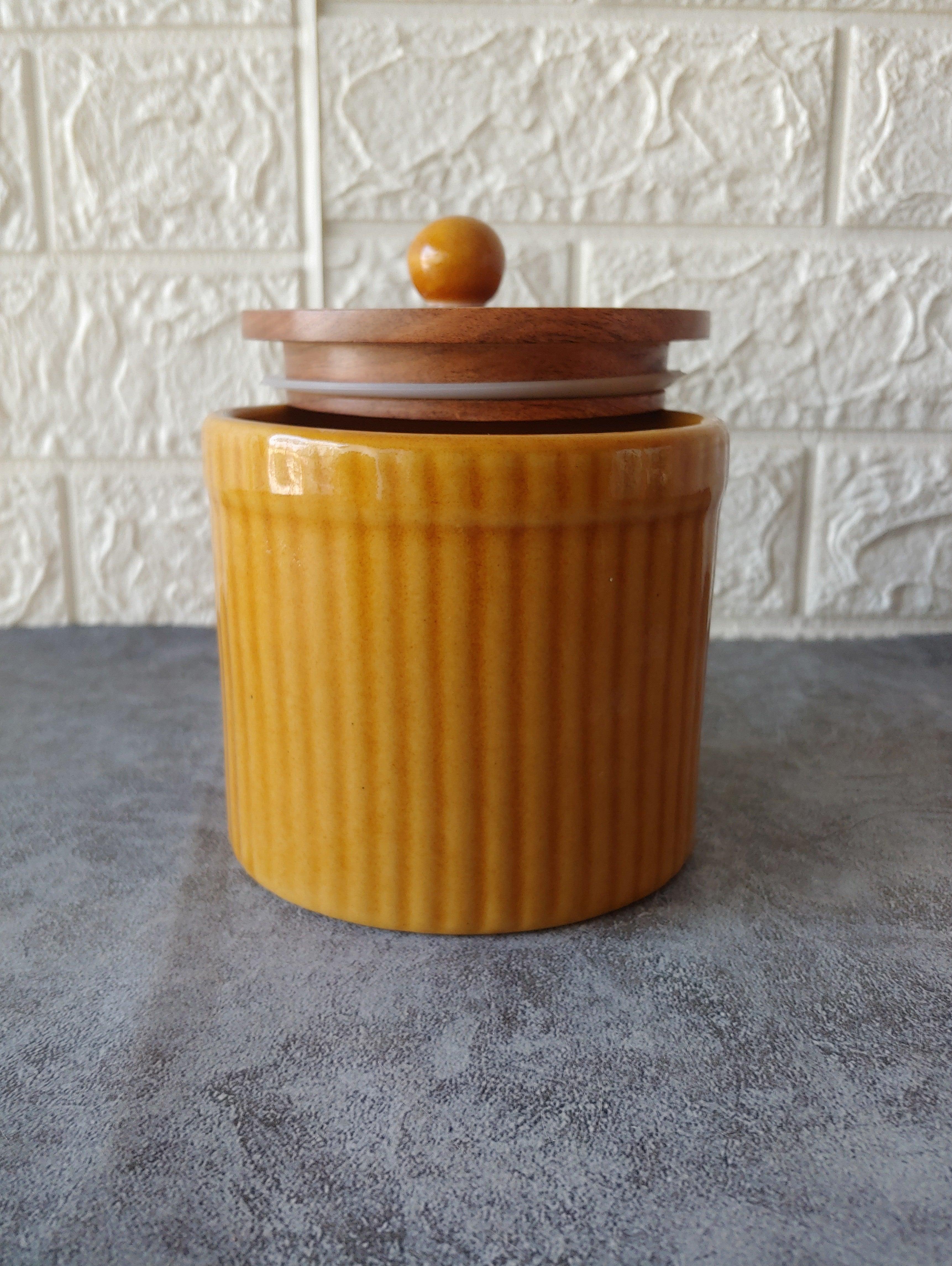 - Unique honey ceramic jar with a wooden lid and ball top.