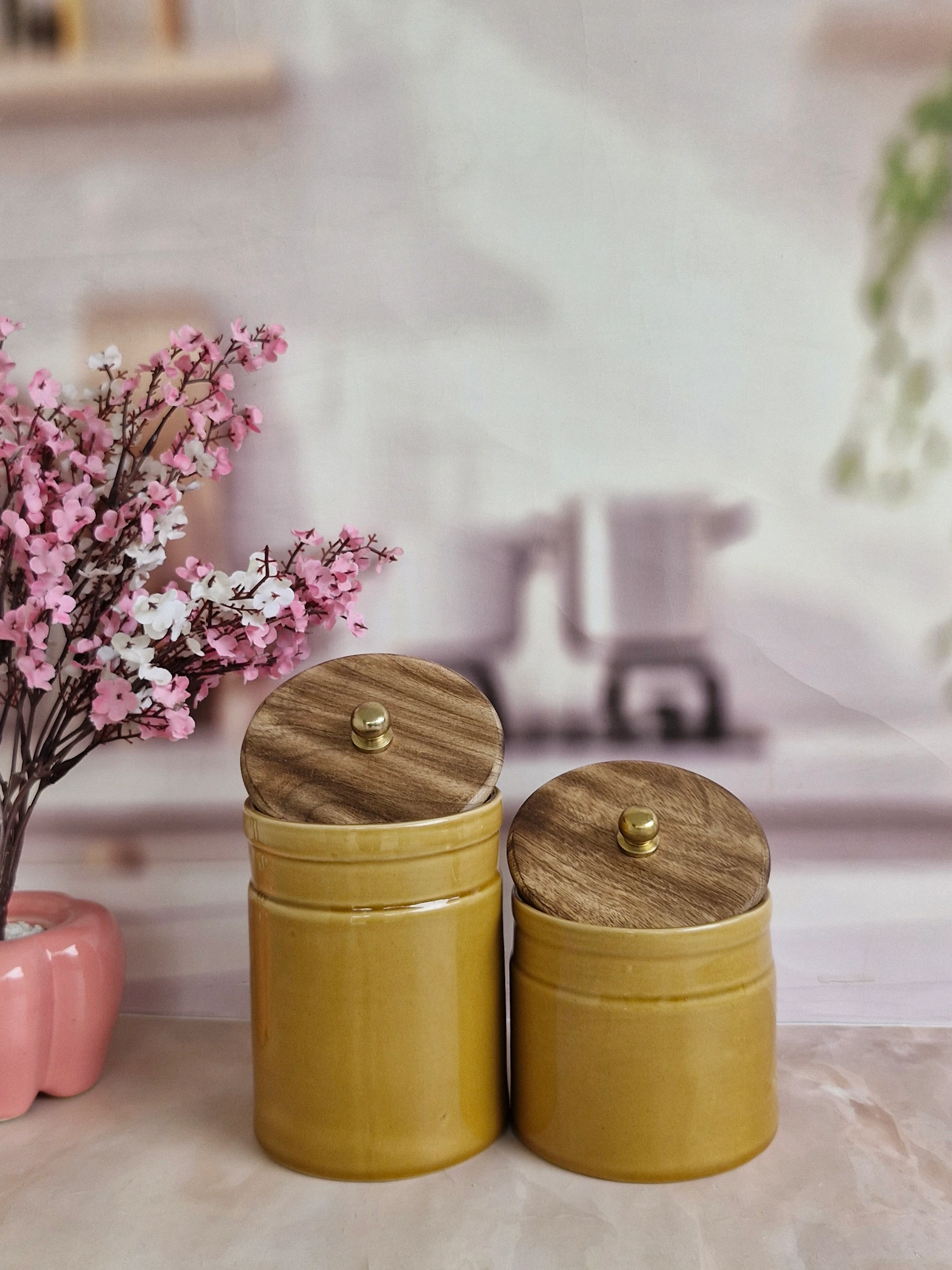 Stylish yellow ceramic storage jar with a wooden lid, ideal for kitchen organization and décor. A beautiful and practical storage solution.