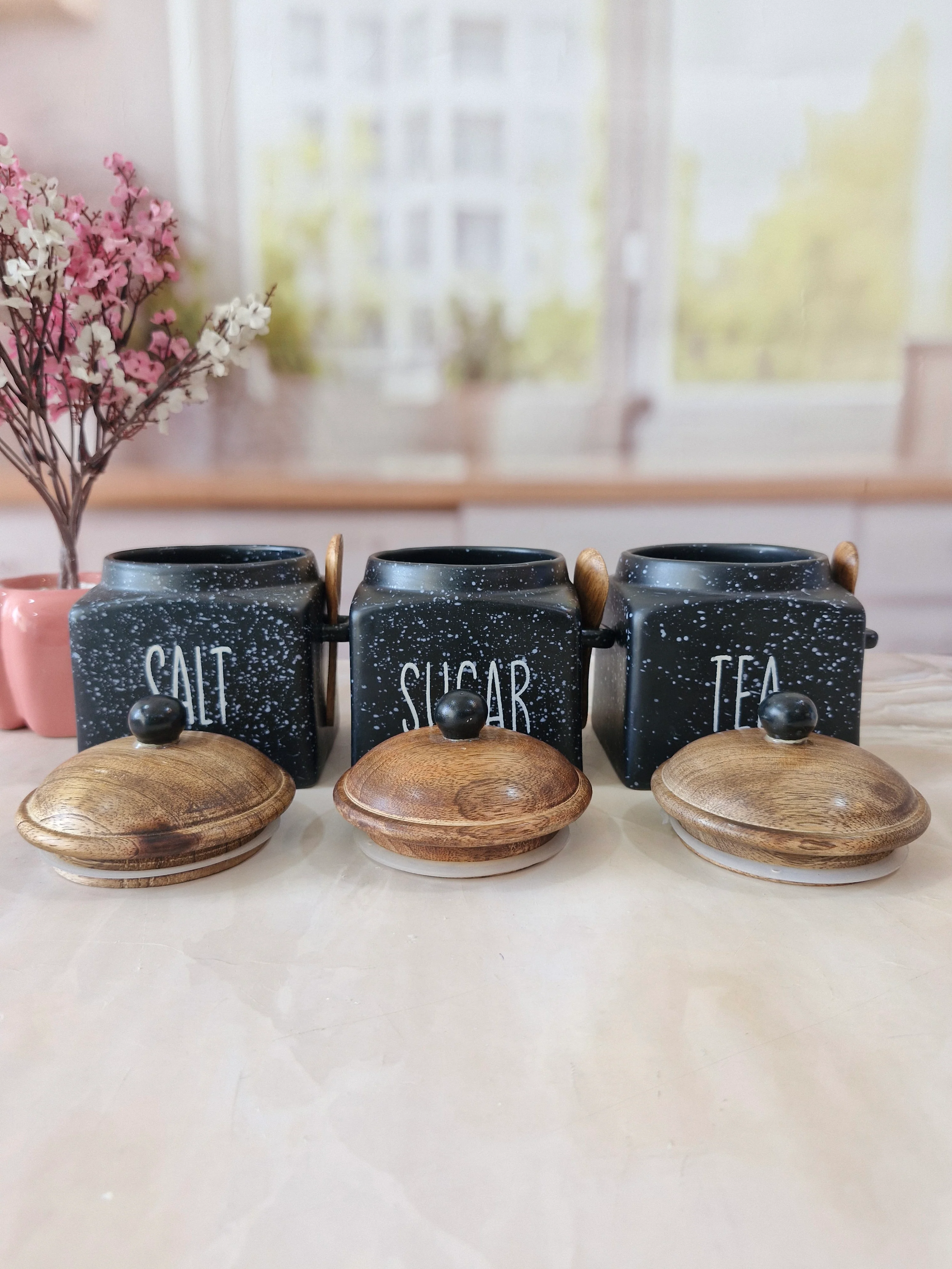 - Clearly Labeled Jars: TEA," "SUGAR" "SALT" for easy organization.